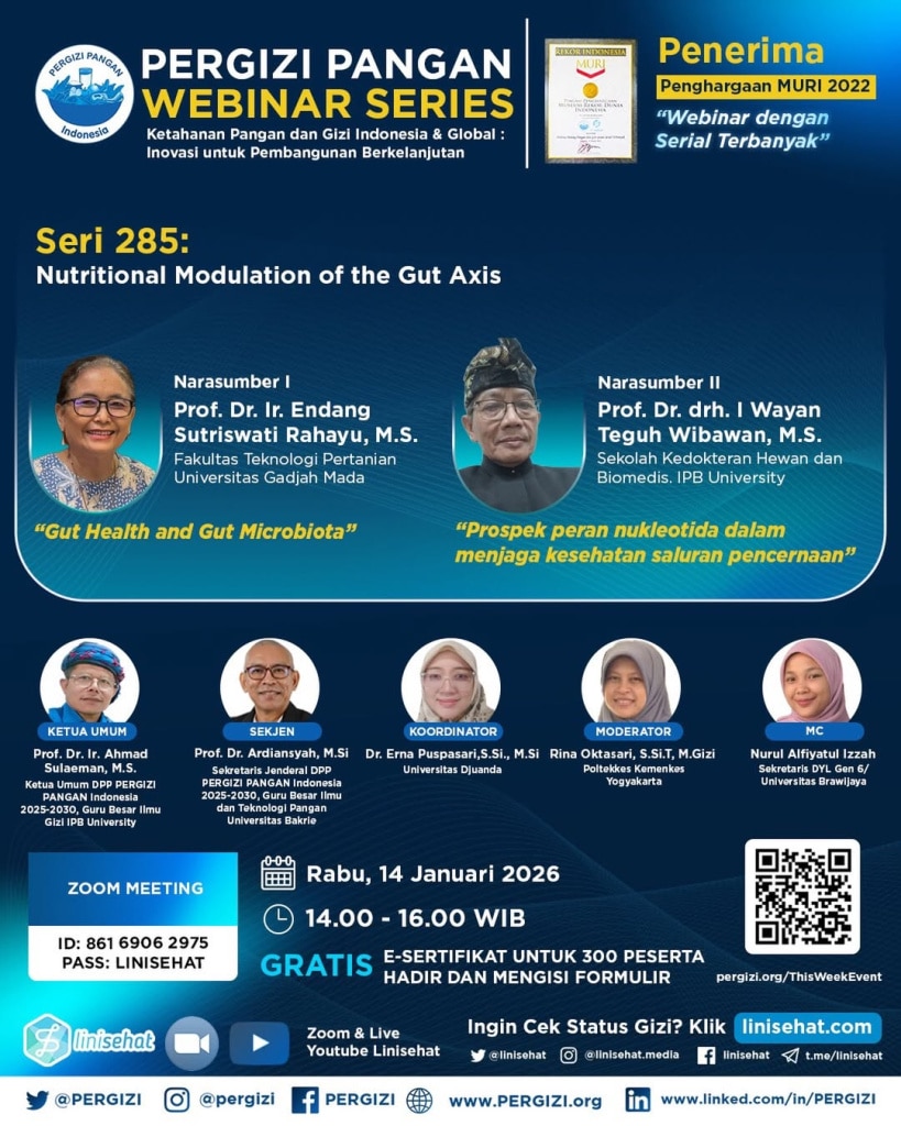 PERGIZI PANGAN Webinar Series 285 Tema: Nutritional Modulation of the Gut Axis ???? Rabu, 14 Januari 2026 ???? Pukul 14.00 Read more