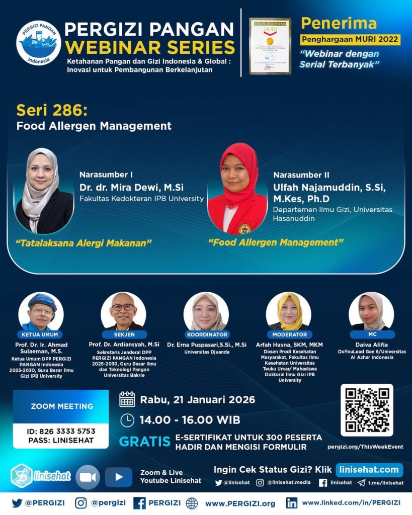 PERGIZI PANGAN Webinar Series 286 Tema: Food Allergen Management ???? Rabu, 21 Januari 2026 ???? Pukul 14.00 - 16.00 WIB Read more