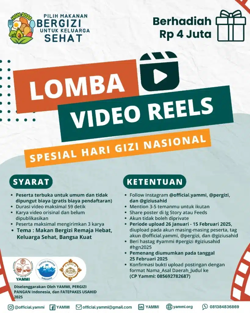 Spesial Hari Gizi Nasional tahun 2025 YAMMI bersama PERGIZI PANGAN Indonesia dan Gizi Universitas Sahid menyelenggarakan : ????️LOMBA VIDEO REELS Read more